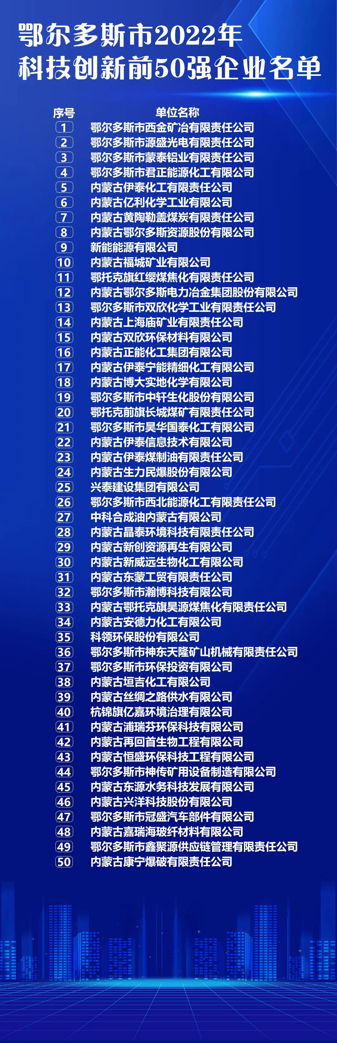 1月30日上午,2023年全市招商引资和优化营商环境暨工业经济高质量发展大会在康巴什召开。在本次大会上,市委、市政府发布了2022年科技创新前50强企业名单,到底花落谁家?来看榜单: