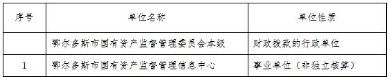 从预算单位构成看,鄂尔多斯国有资产监督管理委员会部门预算包括:局本级预算和局属事业单位预算。