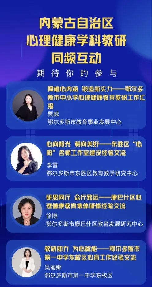 365bet365官网_出行365官方电话_365娱乐场投注东胜区教育教学研究中心李雪老师作《心向阳光 朝向美好》专题分享。李雪老师结合东胜区“六个一”心理健康教育模式和“心阳”名师工作室的建设经验,就工作室“学科导师制”、师师互培等方式助推心理健康教育教师持续快速成长进行了讲解。