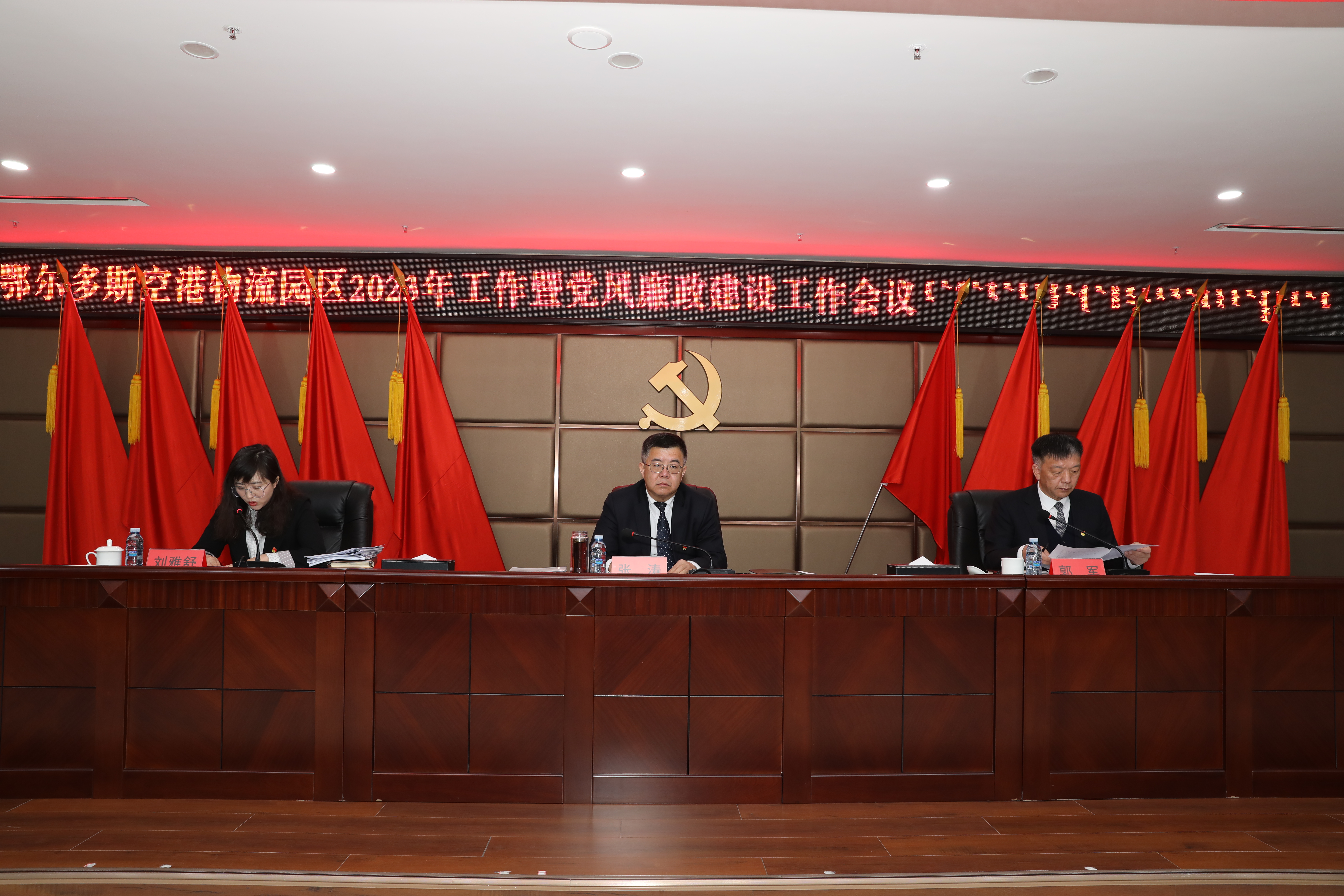 市商务局党组书记、局长,空港物流园区党工委书记张涛出席会议并讲话。党工委委员、纪工委书记刘雅舒作党风廉政建设工作讲话。党工委副书记、管委会主任郭军主持会议并作总结讲话。各职能部门、直属企事业单位,各垂管部门班子成员,各驻园单位和入园企业负责人,市内金融机构代表以及机关全体干部职工参加会议。