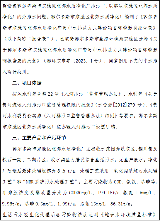 根据江河、湖泊新建、改建或者扩大排污口设置审核程序的有关规定,我局近日受理了365bet365官网_出行365官方电话_365娱乐场投注东胜区北郊水质净化厂排污口设置申请材料。现将有关情况予以公示3个工作日。如有意见,请在公示期内向我局来信来电进行反映。