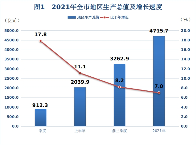 初步核算,2021年全市完成地区生产总值4715.70亿元,扣除价格因素影响,同比增长7.0%。分产业看,第一产业增加值为148.43亿元,同比增长4.4%;第二产业增加值为3077.88亿元,同比增长6.4%;第三产业增加值为1489.39亿元,同比增长8.0%;三次产业结构为3.1:65.3:31.6。人均地区生产总值达到218118元,同比增长6.3%。