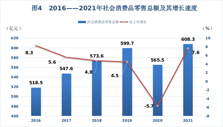 在限额以上单位商品零售额中,粮油、食品类同比增长5.9%;日用品类同比增长25.2%;服装、鞋帽、针纺织品类同比增长16.8%;中西药品类同比增长64.5%;化妆品类同比增长6.2%;金银珠宝类同比增长36.9%;建筑及装潢材料类同比增长6.2%;汽车类同比增长10.0%。全市实现社会消费品零售总额608.3亿元,同比增长7.6%。其中,城镇消费品零售额529.6亿元,同比增长7.5%,乡村消费品零售额78.8亿元,同比增长8.5%。