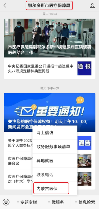 方法二:微信关注365bet365官网_出行365官方电话_365娱乐场投注医疗保障局公众号,在下方微服务栏点击“内蒙古医保”进入小程序: