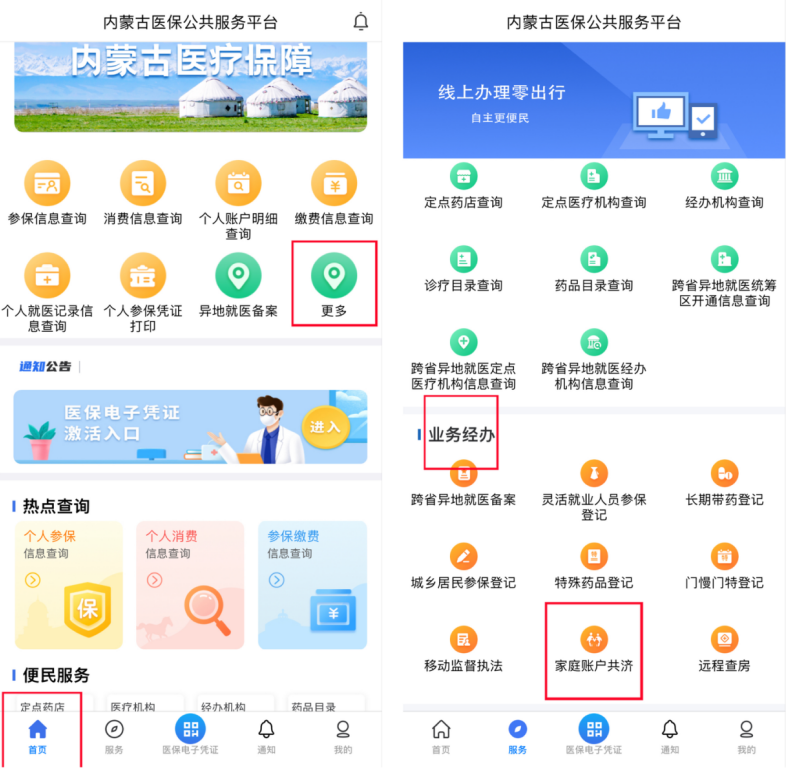完成注册登录后,点击“首页”,选择“更多”,在“业务经办”里选择“家庭账户共济”。