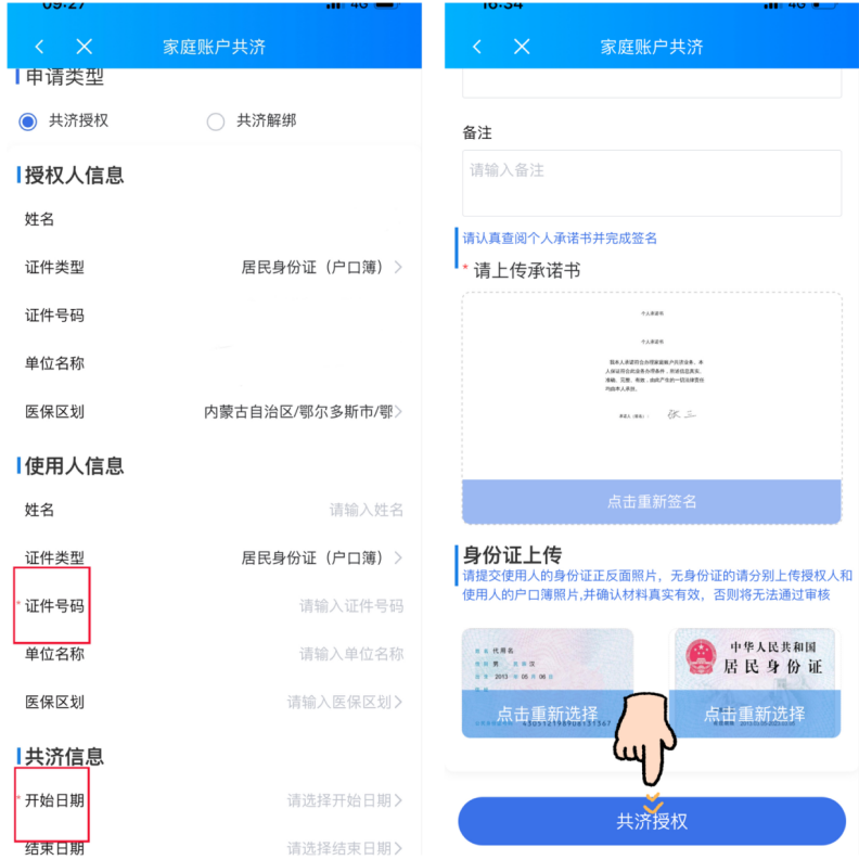 第二步:填写“使用人”信息,输入“开始日期”,阅读个人承诺书并完成签名,上传使用人的身份证正反面照片 ,点击“共济授权”,完成绑定。