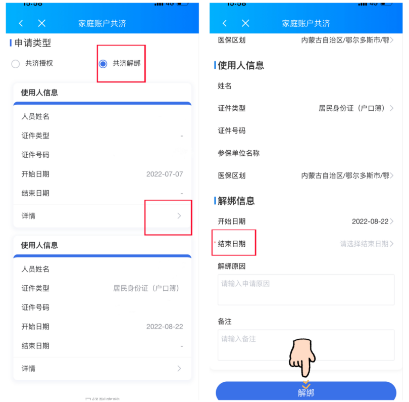 申请类型下点击“共济解绑”,使用人信息下方点击“详情”,“解绑信息”下面选择“结束日期”,点击“解绑”,完成解绑。