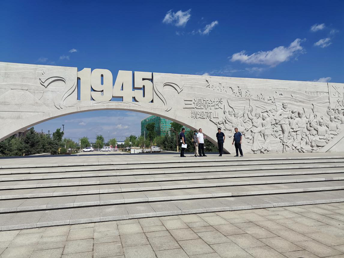城川镇特色小镇景观绿化工程,延安民族学院对面,东西宽度为347m,南北长度为350m,规划面积128731㎡,硬质铺装面积88225㎡,绿化面积40506㎡,中心广场纪念碑为36m高,钢框架支撑结构;东西两侧各设置一座长度为60m,高度为5.7m的钢框架支撑结构的浮雕墙。中心广场东西两侧设置城市带状公园,公园结合配套公建、廊架、树池、雕塑等小品满足市民休闲,中心广场铺装整体以简洁明快的大块铺装为主,颜色以红黄为主色,突出红色主题,两侧公园统一为灰色材质,广场中心区域设置12根特色景观灯柱,强化仪式感与庄重性,便于以后开展大型纪念活动以及群众节日庆典活动。