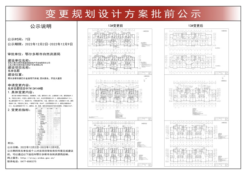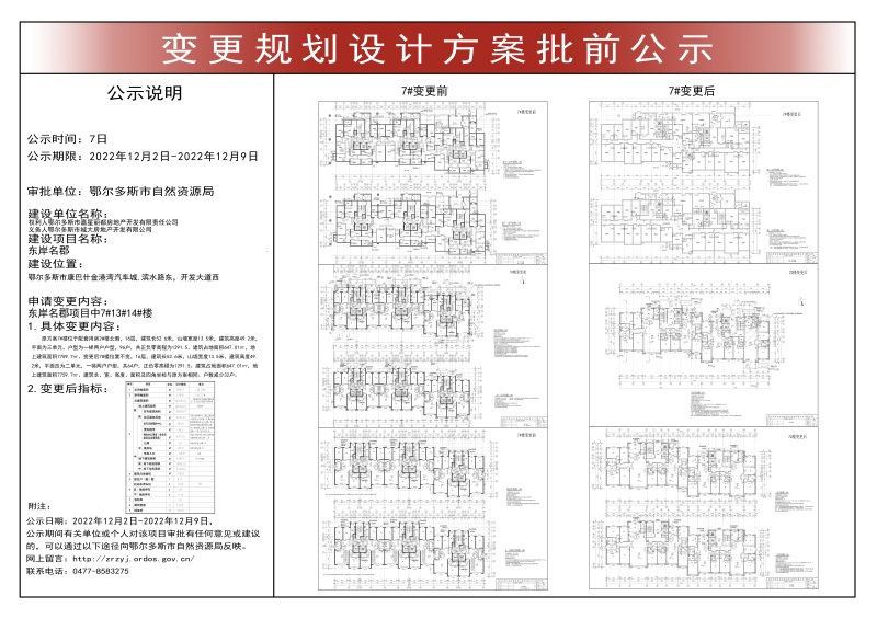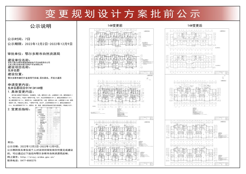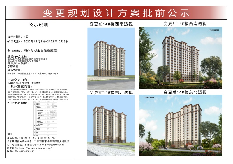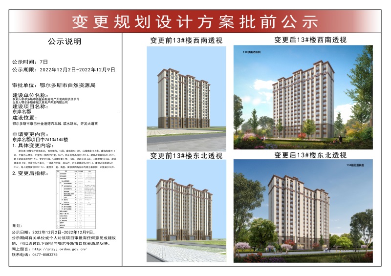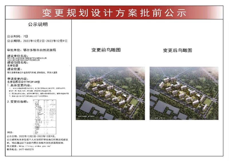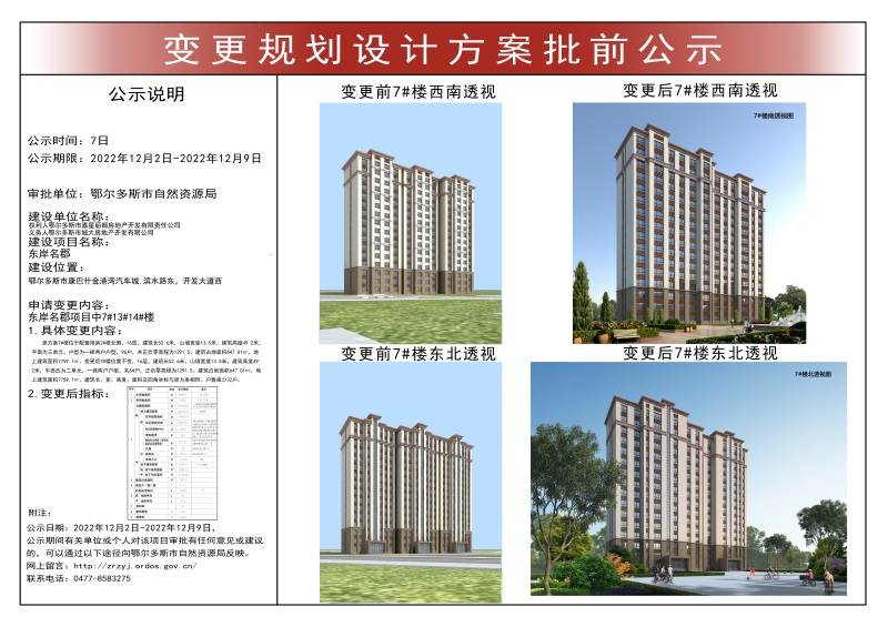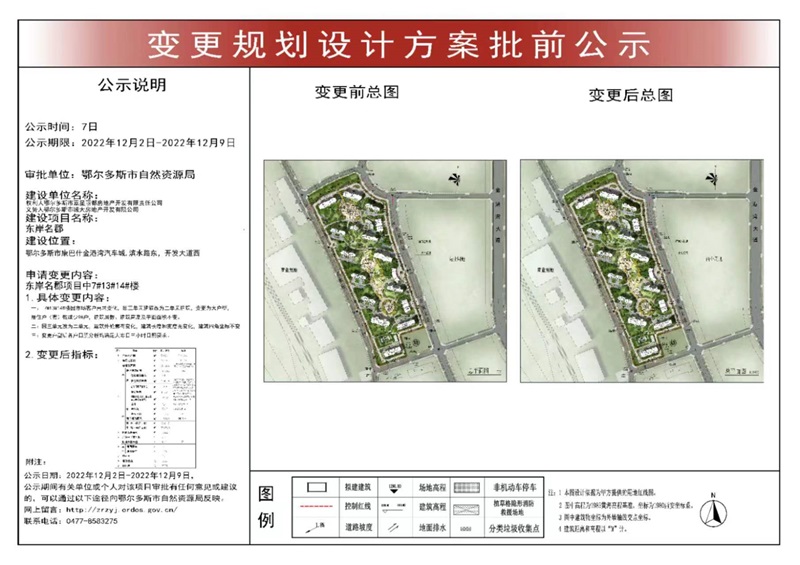 经365bet365官网_出行365官方电话_365娱乐场投注自然资源局研究,拟对变更变更东岸名郡规划设计方案进行批前公示。项目位于康巴什区金港湾汽车城滨水路东、开发大道西的S01-12地块内,变更后7#、13#、14#三栋住宅由三个单元调整为两个单元,户数减少96户,变更后方案总户数为917户,其他规划指标均不变。